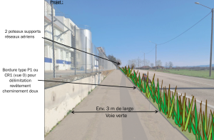 Le projet a dû intégrer de nombreuses contraintes techniques : emprise du tracé, traversée du passage à niveau SNCF, zones humides à préserver, intégration paysagère, et présence d’un ancien réseau d’eau. Le tracé retenu, conforme aux normes en vigueur, permet une sécurisation optimale, notamment au niveau du passage à niveau. Toutefois, l’aménagement de ce dernier constituant un point complexe, sa réalisation fait l’objet d’une étroite collaboration avec SNCF Réseau et les travaux pourraient être différées de quelques mois par rapport au reste de la voie.