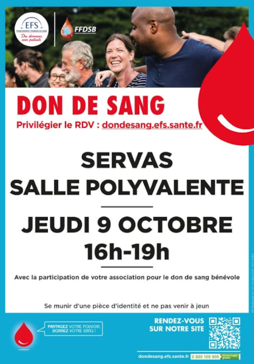 - A Servas le jeudi 9 octobre de 16 h à 19 h.
